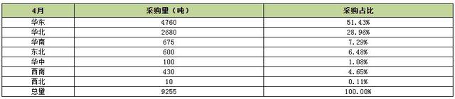 國內潤滑油市場疫情過后需求逐漸恢復,4月車用潤滑油和工業潤滑油需求出現明顯增加,大中型潤滑油工廠庫存量也逐漸消化完畢,進入補貨周期,使得4月份基礎油市場價格出現大幅上揚,漲幅累計在300-400元/噸左右。隆眾電話調研的下游109家潤滑油工廠的生產情況來看,4月份潤滑油工廠全面復工,用油量達到94170噸,相較于3月份環比增加18.53%。其中,有81家完成了采購,采購總量達9255噸。采購量大的以華東、華北為主,分別占比51.43%、28.96%。