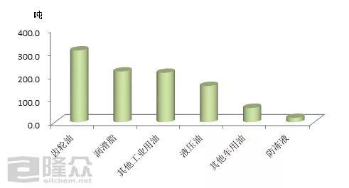 4月齒輪油訂單量308.6噸、潤滑脂訂單量218.1噸、其他工業潤滑油212.6噸、液壓油155.9噸、其他車用潤滑油61.6噸、防凍液18.8噸。